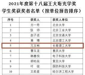 近日,我國光學領(lǐng)域的“重量級”社會獎項──第十八屆王大珩光學獎評選結(jié)果揭曉,共評選出學生獎獲得者30名,吉林省僅有兩名學生獲獎。其中,我校光電科學學院畢業(yè)生、現(xiàn)長春理工大學光電工程學院在讀博士研究生亢玉彬獲得此獎。