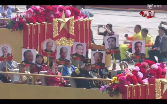 左三為我校名譽院長王大珩院士(在慶祝中華人民共和國成立 70 周年大會的“致敬”方陣禮賓車上,我們的名譽院長王大珩院士照片,與毛澤東、周恩來、朱德等 6 位開國元勛的照片一起駛過天安門廣場)