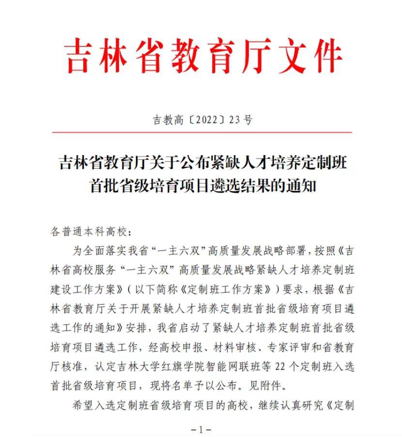 為全面落實(shí)“一主六雙”高質(zhì)量發(fā)展戰(zhàn)略部署,吉林省教育廳啟動(dòng)了緊缺人才培養(yǎng)定制班首批省級(jí)培育項(xiàng)目遴選工作,經(jīng)高校申報(bào)、材料審核、專家評(píng)審和省教育廳核準(zhǔn),認(rèn)定 22 個(gè)定制班入選首批省級(jí)培育項(xiàng)目。我校“長(zhǎng)光工程師定制班”成為首批省級(jí)緊缺人才培養(yǎng)定制班培養(yǎng)項(xiàng)目之一。